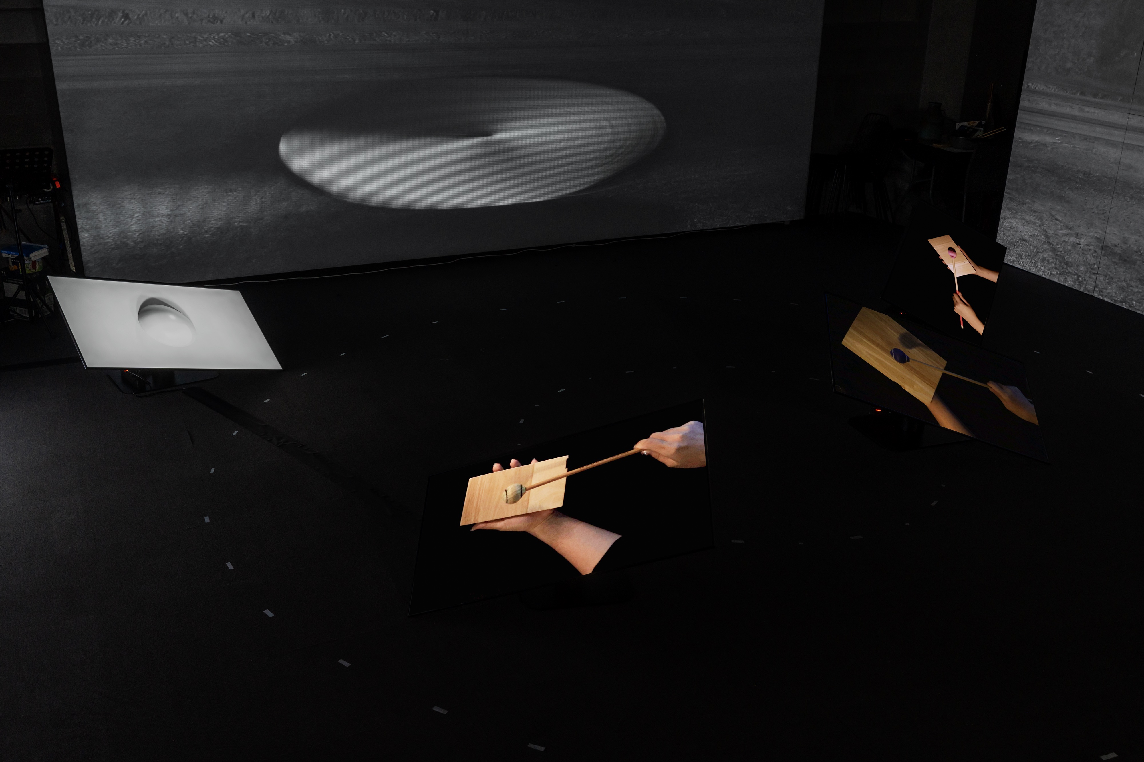 PLAP은 장르 간의 경계를 전제로 두지 않고, 서로 다른 매체와 감각을 교차시키고 실험할 수 있는 프로그램이었습니다. 이러한 방향성은 기존 저희의 시각예술 작업의 감각과 시간의 경험을 어떻게 복합적으로 확장할 수 있을 것인가라는 저희의 문제의식과 맞아떨어졌습니다. 특히 타악기 연주자와의 협업을 통해 시각 이미지와 사운드, 리듬이 위계 없이 동등한 층위에서 작동하는 작업을 구상할 수 있었던 점이 중요했습니다. 이는 정지된 이미지가 아닌, 시간 속에서 생성되고 변형되는 감각을 다루고자 했던 저희의 관심사를 구체화할 수 있는 계기였습니다.