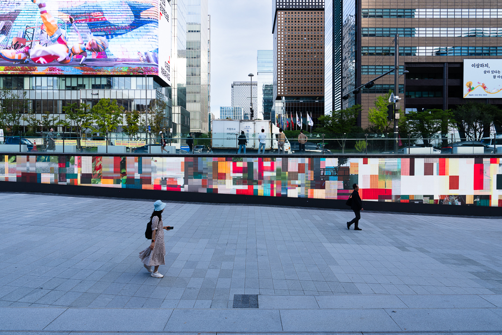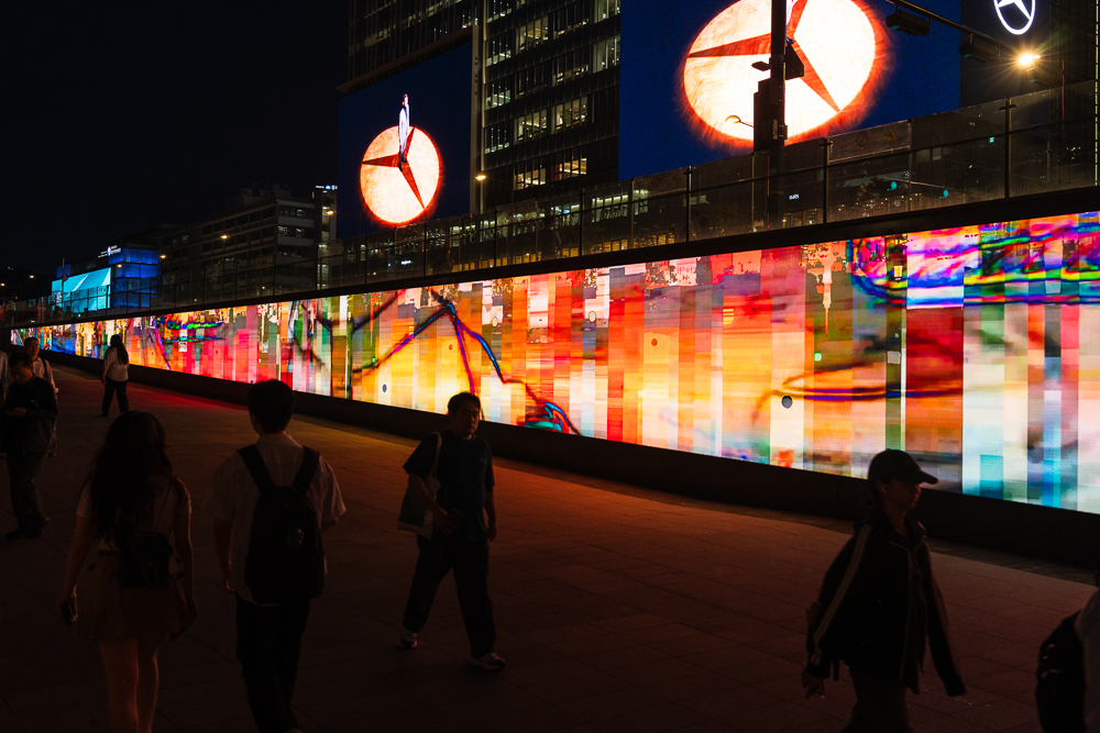 한편, 공간성과 장소성을 직접적으로 반영한 공공미술 프로젝트들을 진행한 바 있는데요. 해치마당 미디어아트(2025), 돈의문 페스티벌(2024), 여의도 더 현대 디지털 사이니지 전시(2023), 수원화성 미디어아트(2023), 플루리포텐트 아트스페이스 개관전(2023) 등에서 작품을 하나의 독립된 이미지로 제시하기보다는, 각 장소에 축적된 역사적 시간, 공간의 동선과 시선, 그리고 관객의 일상적 움직임에 주목한 실험적 시도들을 해 왔습니다. 특정 공간이 지닌 맥락과 리듬을 출발점으로 삼아, 미디어가 공간을 점유하기보다 디지털 이미지가 장소의 기억과 현재의 사용 방식, 그리고 동시대적 감각이 겹쳐지는 하나의 장면으로 작용하도록 하는 데에 관심을 가지고 있습니다.