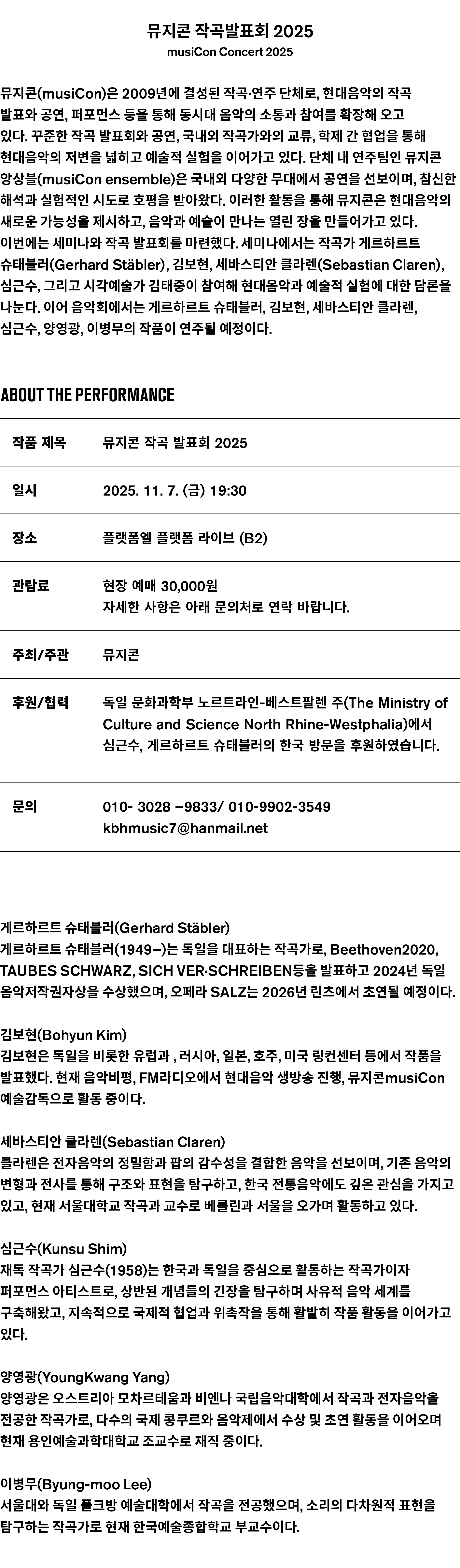 게르하르트 슈태블러, 김보현, 세바스티안 클라렌, 심근수, 양영광, 이병무, 현대음악앙상블 위로, 뮤지콘 앙상블, 김태중