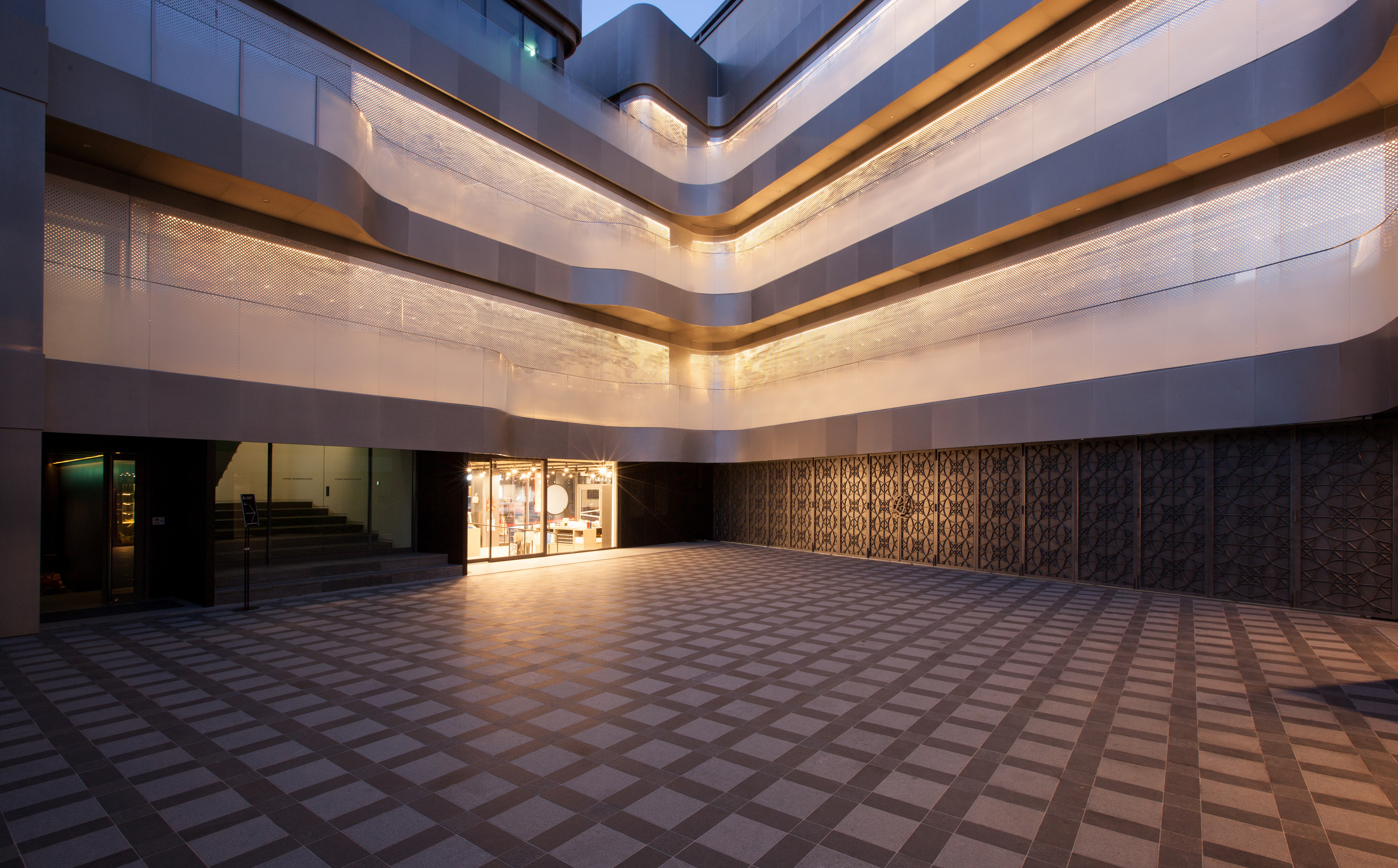 서양의 중정 또는 한국의 전통적인 마당과 닮아있는 플랫폼엘의 링크야드는 용도에 따라 둘로 나뉜 건물을 연계하는 중요한 지점이며 비워진 공간 그 자체로도 독립적으로 기능합니다. 중정은 전시장과 지하 플랫폼 라이브에서 진행하는 프로그램을 연계하고 1층의 스토어 및 카페 공간, 2, 3층의 휴게공간까지 확장할 수 있습니다. 야외 오페라 하우스와도 같은 이 중정은 정면 250인치 스크린을 사용하여 야외 스크리닝 및 다양한 프로그램이 진행됩니다.